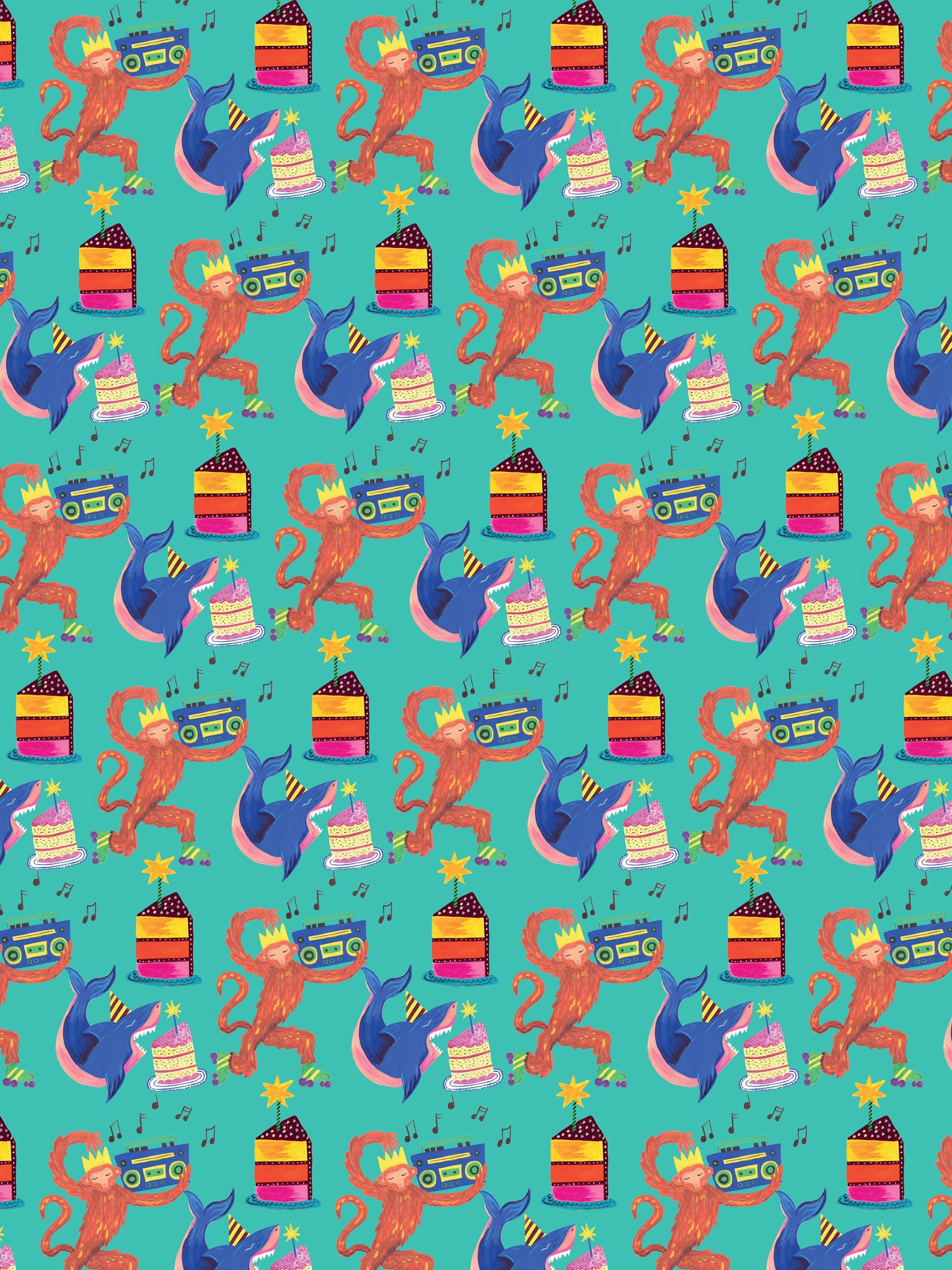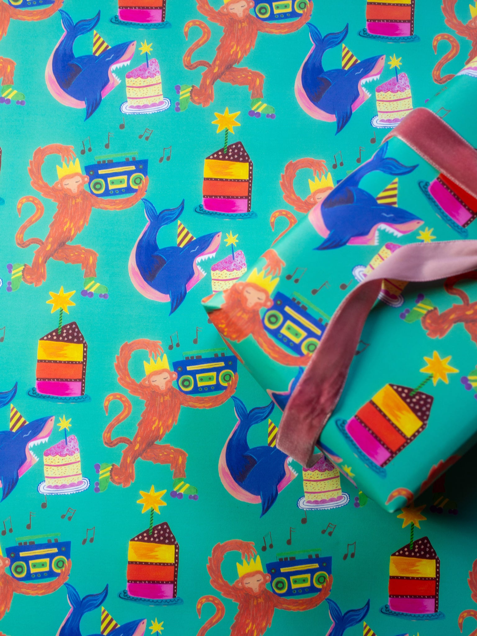 This glorious wrapping paper features dancing monkeys, party sharks and delicious rainbow party cakes. A magical gift wrap which is suitable for many occasions and is sure to delight.